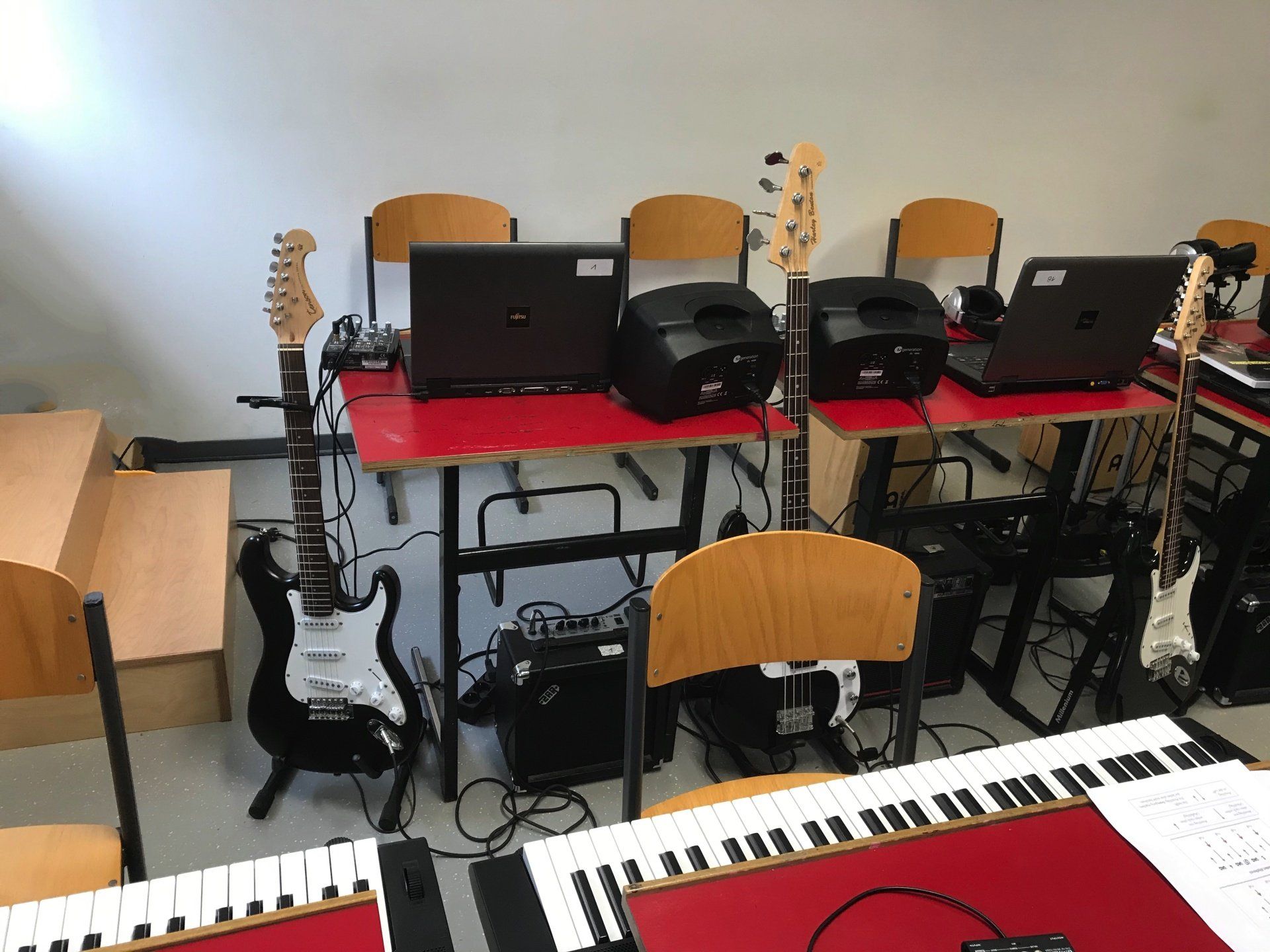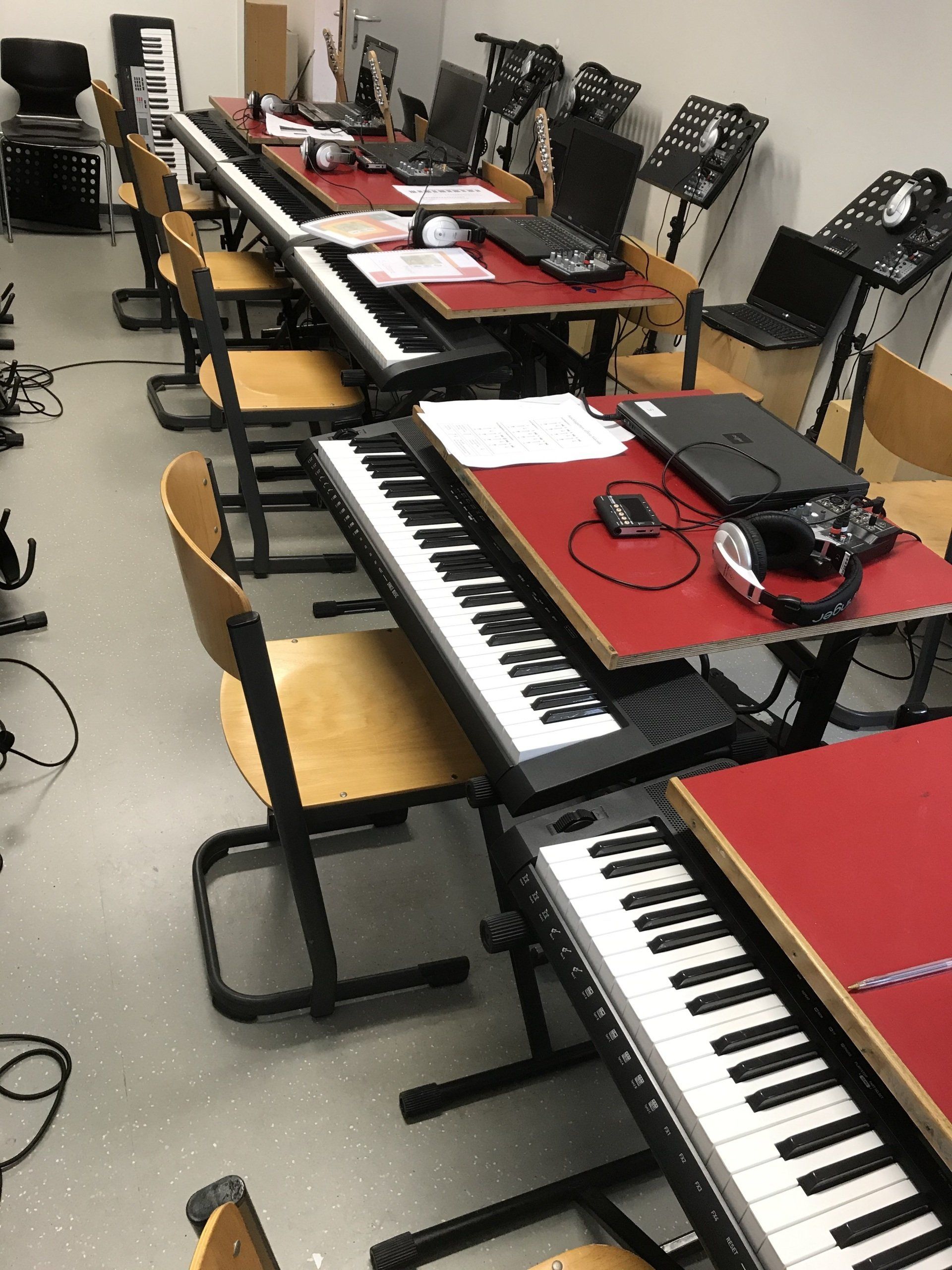 In den „LABO[H]Ren“ haben die Jugendlichen ihren individuellen „Arbeitsplatz“ mit Instrument, Computer, Mischpult und Kopfhörer, an dem sie ungestört erste Erfahrungen mit ihrem Instrument machen, musizieren und, wie in einem Labor, Musik erforschen und neu entwickeln können. Die „LABO[H]Re“ vereinen die Vorteile des Einzelunterrichts mit denen des Gruppenunterrichts. Jeder Schüler kann individuell betreut werden, ohne dass die anderen in ihrer Arbeit gestört werden. Gleichzeitig haben wir jederzeit die Möglichkeit, gemeinsam zu musizieren. Die einzelnen „LABO[H]Re“ verschmelzen dann zum „BandO[H]Rchester“.